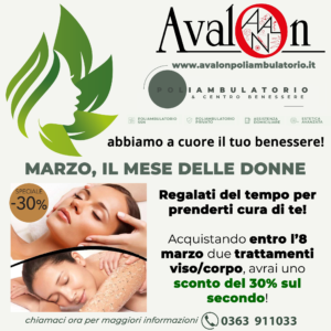 Acquistando entro l’8 marzo due trattamenti viso/corpo, avrai uno sconto del 30% sul secondo!