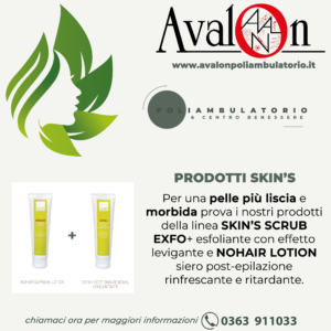 Per una pelle più liscia e morbida prova i nostri prodotti della linea SKIN’S SCRUB EXFO+ esfoliante con effetto levigante e NOHAIR LOTION siero post-epilazione rinfrescante e ritardante.